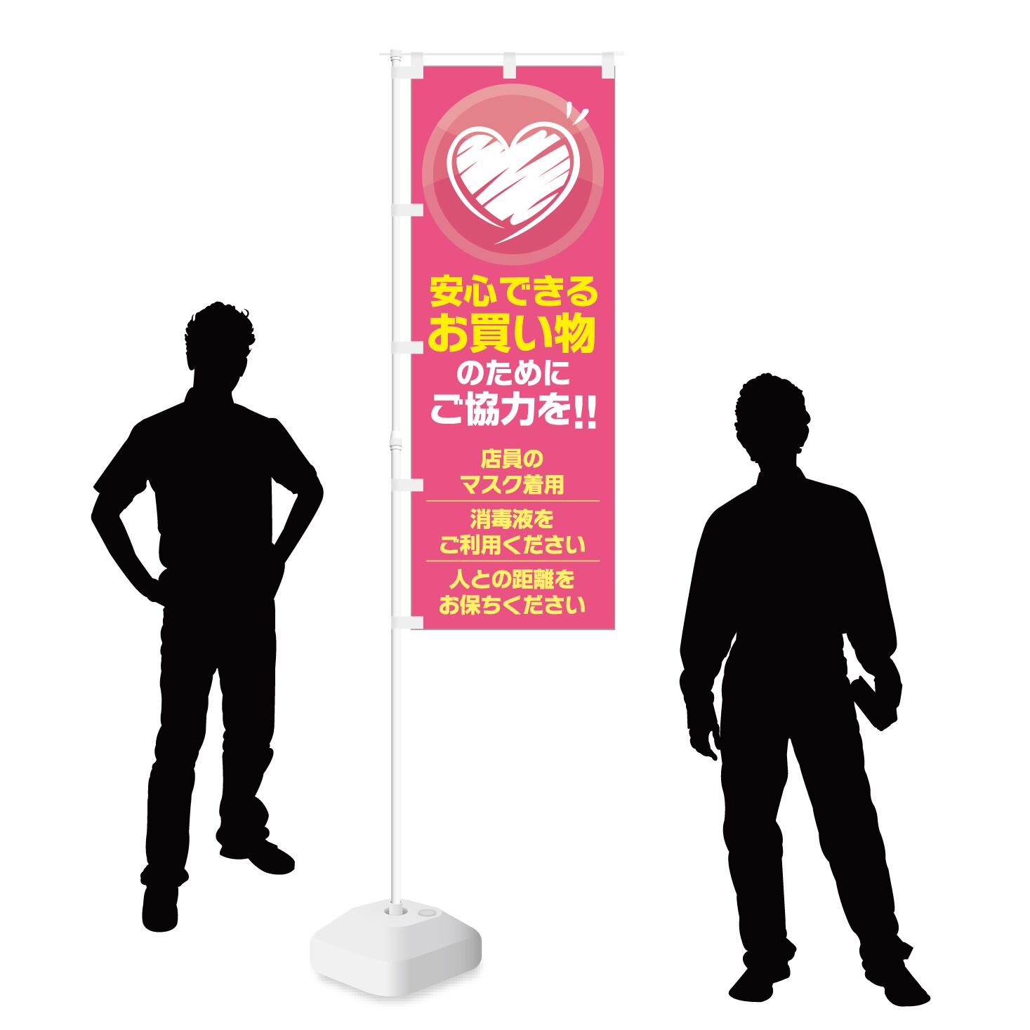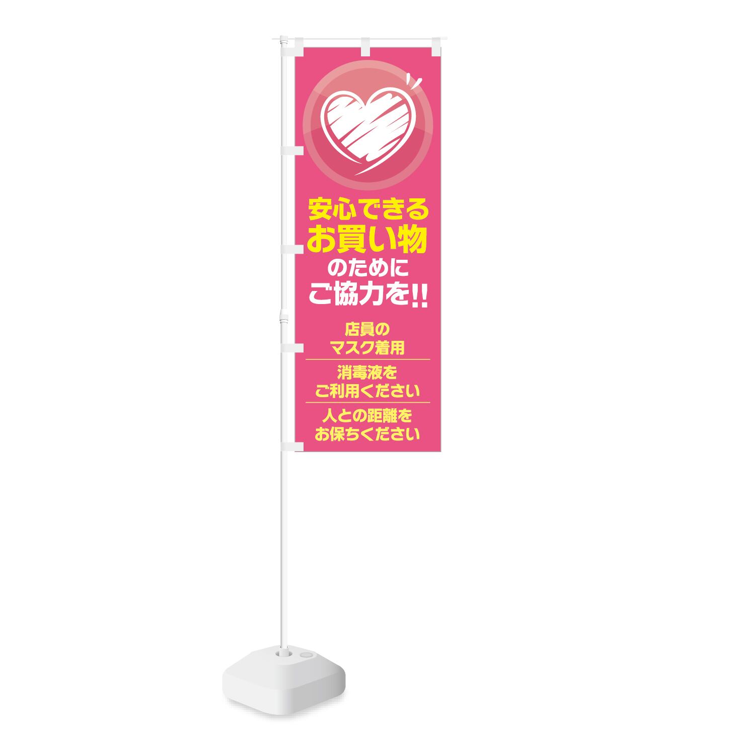 【 安心できるお買い物のために マスク着用 消毒液 人との距離 】のぼり旗です。